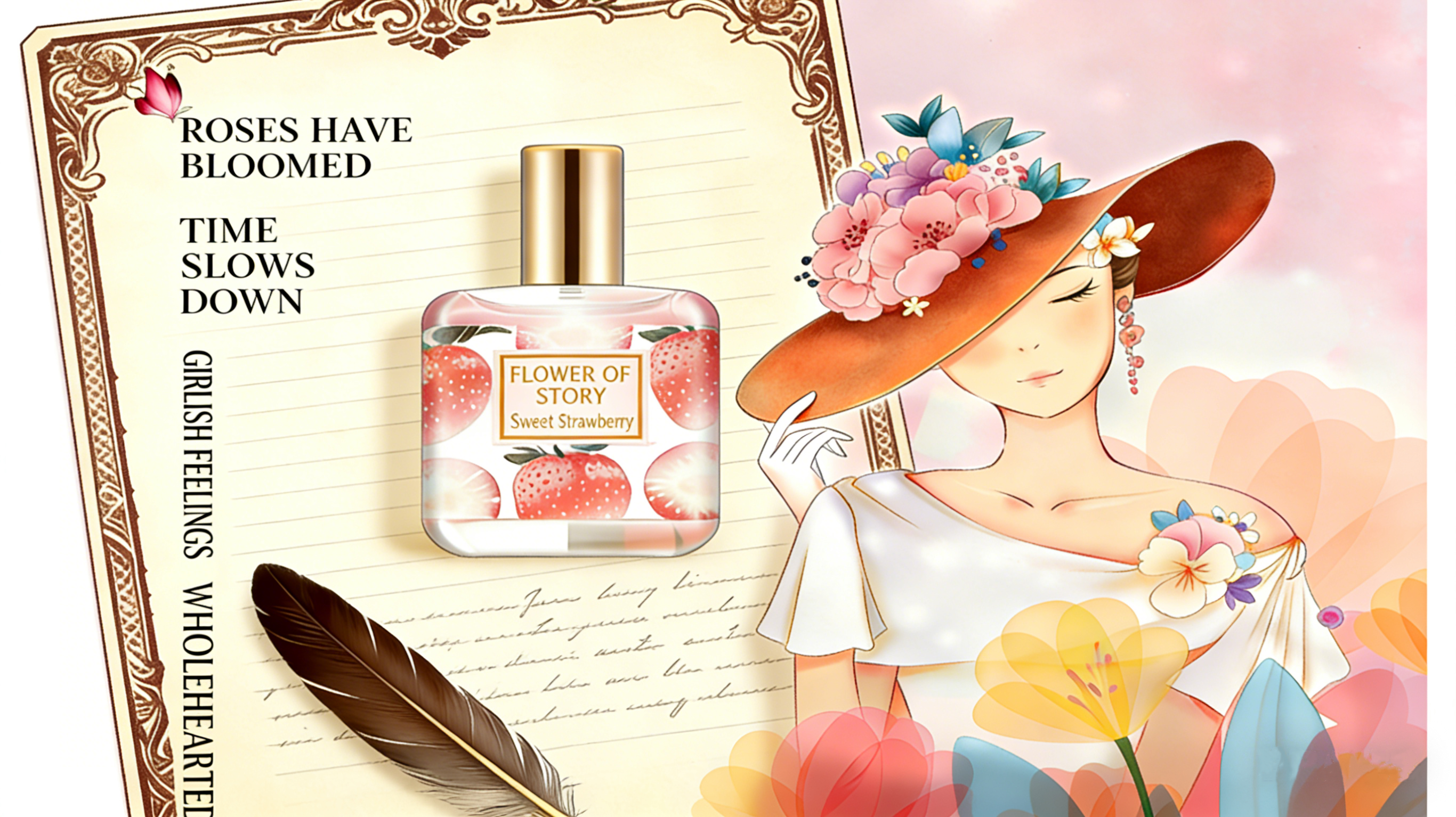 The name of the perfume used by the model in the video is "First Love Strawberry."